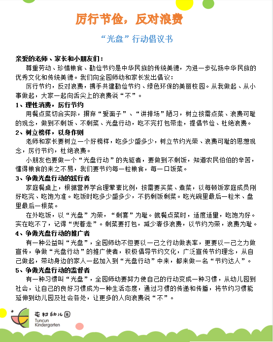 厉行节约,拒绝浪费,这是我们每一个人必须履行的责任。此次光盘行动,不仅帮助幼儿养成了不挑食、不浪费、爱惜每一粒粮食的好习惯。也通过幼儿用自己的行动感染身边的每一个人,让节约延续到每个家庭,让大家以节约为荣,让节约成为一种时尚,让节约成为一种社会潮流,让节粮成为一种习惯。