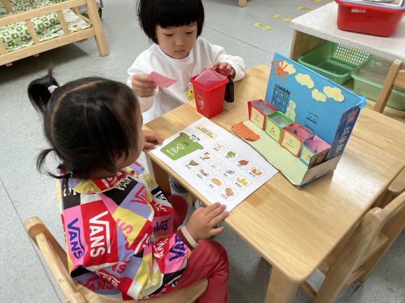 孩子们通过自主小游戏、绘画表征、废旧物品变废为宝,强化垃圾分类。