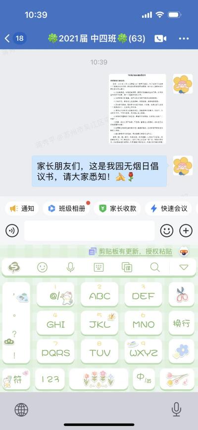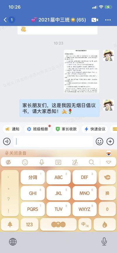通过家园微信群进一步向幼儿家长宣传吸烟有害健康和孩子被动吸二手烟的危害,提高他们珍爱生命和保护健康的意识,为创建无烟环境出一份力。